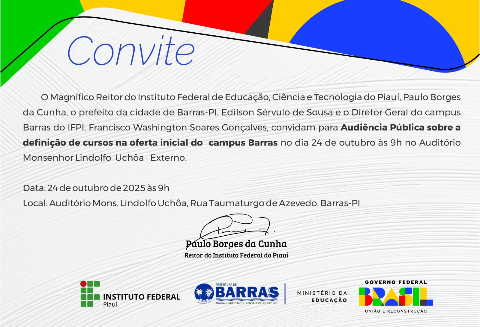 Uma audiência pública será realizada no auditório Monsenhor Lindolfo Uchoa, em Barras, com o objetivo de apresentar o processo de consulta pública para a escolha dos cursos que serão ofertados pelo Instituto Federal do Piauí (IFPI) no município.